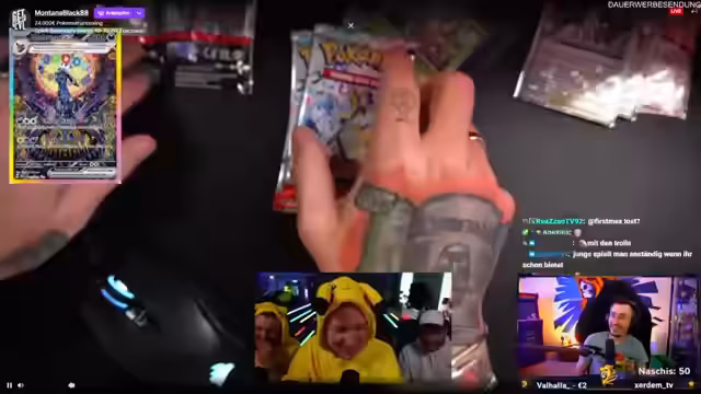 05:48:58Es wird über Erfahrungen mit nicht erhaltenen Pokémon-Karten aus früheren Aktionen gesprochen, wobei der Streamer erwähnt, dass er vor drei Jahren viel Geld für Packs bezahlt hat, die nie ankamen. Als Konsequenz daraus werden nun die aktuellen Packs an die Community verlost, um nicht selbst für etwaige Probleme verantwortlich gemacht zu werden. Es wird spekuliert, dass einige bekannte Persönlichkeiten ihre Karten ebenfalls nicht erhalten haben. Die Community-Mitglieder tauschen sich über ihre Erwartungen an die bevorstehende Kartenöffnung aus, wobei einige auf seltene Karten wie Mewtwo oder Glurak hoffen. Der Streamer betont den Unterschied zwischen reich sein und süchtig sein, während die Teilnehmer über die Kosten und den potenziellen Wert der zu öffnenden Pokémon-Kartenbox im Wert von 24.000 Euro sprechen. Es wird die Geschichte erzählt, wie der Streamer für Pokémon-Karten vor vier Jahren 80.000 Euro ausgegeben hat.