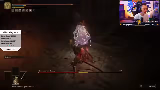 10:40:35Der Streamer kommentiert den aktuellen Run und die verwendeten Taktiken, einschließlich des Einsatzes von L2-Attacken und des aktuellen Standorts in Cellit. Er spricht über nervige Dreiecksfallwixer-Bosse und seine Bann-Praktiken im Win-Channel. Er diskutiert Trick-Challs und seine aktuelle Situation im Spiel. Er äußert Frustration über den Kampf gegen zwei Baumwächter und beschreibt, wie sie ihn in die Ecke drängen. Er erklärt, wie er einen der Baumwächter aktiviert, indem er zu nah an ihm vorbeiläuft. Er reagiert auf einen Kommentar von Justin und erklärt seine Beweggründe für das Nicht-Bannen. Er erklärt die Taktik, wie man die Baumwächter-Bosse besiegt. Er erlaubt seinen Zuschauern ihn zu beleidigen. Er gibt Tipps zum Kampf gegen Elemer von den Dornen und empfiehlt die Verwendung von Margits Kette. Er diskutiert die Verwendung von Tränen bei Moog und bedauert, die Opale im Training nicht genommen zu haben. Er gibt Justin Tipps und erklärt, wo er Moogs Kette finden kann. Er äußert seine Frustration über den unsichtbaren Gegner und seine fehlende Ausdauer. Er lobt Danny für seine Leistung ohne die fetten Fickhammer. Er ist stolz auf Danny. Er diskutiert seine Strategie für Radahn und die Beschwörung von Aschen. Er macht Späße über Matzes Spielweise und sein Alter. Er spricht über den Wurmgesicht-Boss und seine bisherigen Tode. Er gibt Tipps zum Töten des Wurms. Er erwähnt Tier 8 und seine Schwierigkeit. Er reagiert auf Glückwünsche und spricht über seine Vorliebe für den Kampf gegen Godskin-Apostel. Er spricht über die Max-Tiers und die kommenden DLCs. Er spricht über seinen Nemesis, den Todesvogel. Er gibt Tipps, wie man den Todesvogel besiegt.