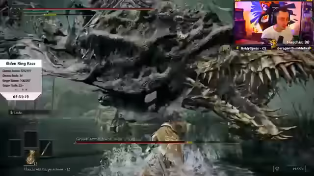14:18:31Der Streamer äußert seinen Ärger über einen Vogelgegner, der ihn immer wieder mit einer One-Shot-Attacke tötet. Er erzählt, dass er im Kampf gegen diesen Boss bereits sehr gut gespielt hatte, bevor er besiegt wurde. Es wird über die Schwierigkeit verschiedener Bosse diskutiert und der Streamer fragt seinen Bruder nach dessen Erfahrungen. Er spricht über den Kampf gegen einen bestimmten Vogelboss in Tier 10 und vergleicht dessen Schwierigkeit mit anderen Gegnern. Der Streamer äußert den Wunsch, gegen Malenia zu kämpfen und sie zu besiegen. Er spricht über verschiedene Strategien und Waffen, die er im Kampf einsetzen möchte. Es wird über die Bedeutung von Ausdauer im Spiel gesprochen und der Streamer berichtet von seinen Schwierigkeiten aufgrund mangelnder Ausdauer. Er erzählt von einem erfolgreichen First Try gegen Malekith und äußert seine Begeisterung für den Kampf.
