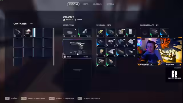 06:03:20Die maximale Spieleranzahl in einer Lobby wird thematisiert, wobei 21 Spieler im Solo-Modus als viel empfunden werden. Es wird diskutiert, ob Spieler auch später einer Lobby beitreten können. Anschließend werden ideale Waffenkombinationen besprochen, insbesondere Ferro mit Stitcher, die als „krass“ bezeichnet wird. Es wird auch über die Herkunft von Waffen auf Stufe 3 gerätselt, die als grau eingestuft sind. Die Munitionstypen (schwer und leicht) und die optimale Menge an Magazinen (ca. 100) werden ebenfalls erörtert. Die Möglichkeit, Gegenstände per Doppelklick in den Rucksack zu verschieben, wird als nützlich erkannt.