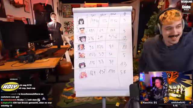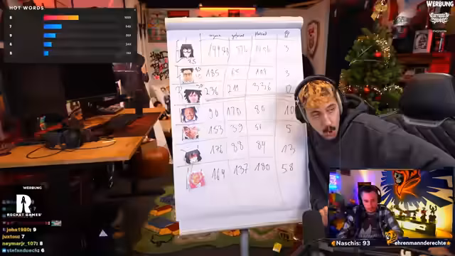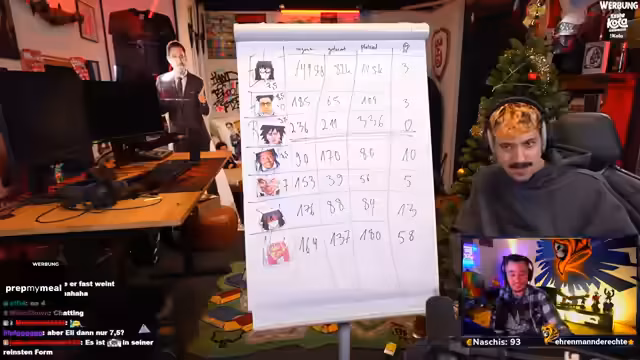 01:51:06Die Diskussionen drehen sich um die bevorstehenden Stream Awards und ein geplantes Abendessen. Es wird vorgeschlagen, am Donnerstagabend während der Stream Awards ein besonderes Ritual am Tisch einzuführen: Jedes Mal, wenn eine der 'Säulen' (wichtige Teammitglieder) einen Preis gewinnt, müssen alle Säulen einen Drink zu sich nehmen und eine Rede halten, während die anderen sie anfeuern. Für Freitag, den 5. Dezember, ist ein traditionelles Treffen im Restaurant 'Sensor Kahn' geplant, das als Feiertag für die Säulen gilt. Ein besonderer Gast, G-Time, wird ebenfalls eingeladen, nachdem er sich ein Video des Restaurants angesehen hat. Die logistischen Herausforderungen der Anreise nach Frankfurt werden besprochen, wobei eine V-Klasse für den Transport von Köln nach Frankfurt in Betracht gezogen wird.