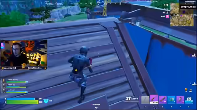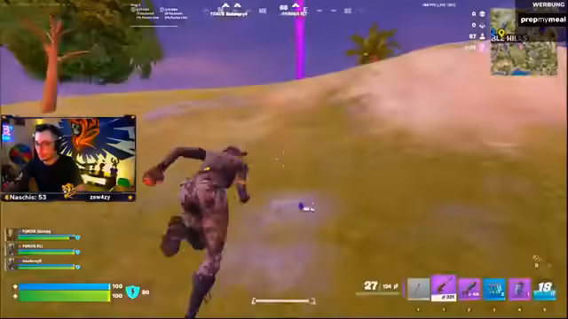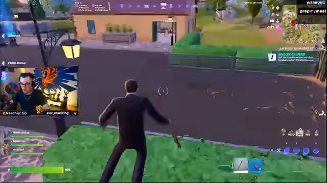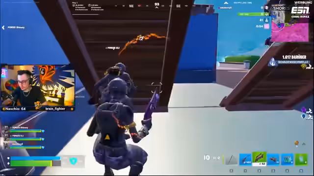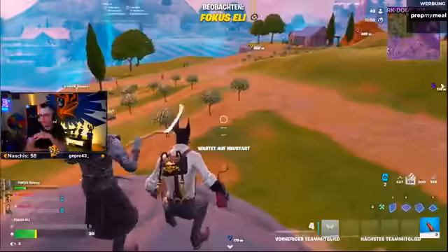 03:43:56Das Event geht mit einer normalen Runde weiter. Die Startposition wird auf einen Berg verlegt, um in der Anfangsphase Gegner, die in die nahe gelegene Stadt fliegen, direkt angreifen zu können. Trotzdem scheint das Team im Startloot zu kämpfen, da der Streamer unzufrieden mit der gefundenen Ausrüstung ist und sein Team dazu auffordert, sich auf einen bestimmten Spawnpunkt zu konzentrieren. Die Stimmung ist eine Mischung aus Konzentration auf den Sieg und der typischen Banter, die den Stream ausmacht.