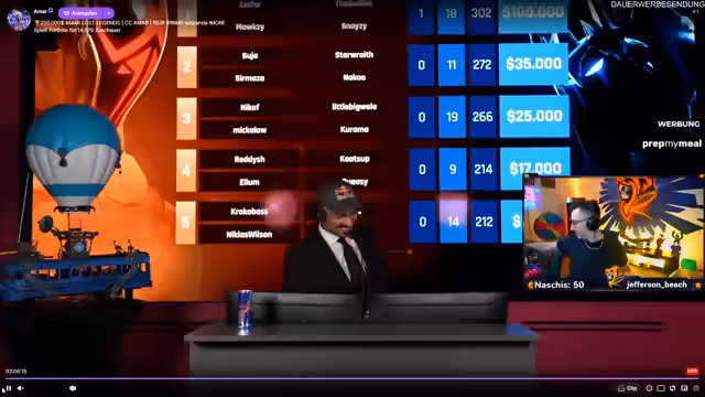 01:17:12Während des Streams kommt es zu einem verbalen Schlagabtausch mit dem französischen Team Ali Boumaier und JJ Capone. Repaz witzelt über die法语kenntnisse und deren Turnierstil. Gleichzeitig zeigt er große Bewunderung für den Teamgeist des französischen Duos, insbesondere nach einem Streit, in dem Capone seinen Freund verteidigte, was repaz als 'löwenhaft' bezeichnet.