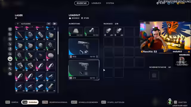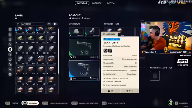 00:16:45Im Laufe des Streams konzentriert sich der Streamer intensiv auf das Management seiner Ausrüstung. Er farmt Schätze und Waffenteile, insbesondere der Veneta 4 und Anvil 4, um sein Projekt voranzutreiben. Er sortiert, repariert und optimiert seine Waffen, indem er Aufsätze wie Mündungsbremse und Schaft hinzufügt, um Platz im Inventar zu schaffen und die Waffenleistung zu verbessern. Besonders die Suche nach einem Schalldämpfer 3 und die Analyse von Waffen-Perks wie der Feuerrate bei Schrotflinten stehen im Mittelpunkt der Aktionen.