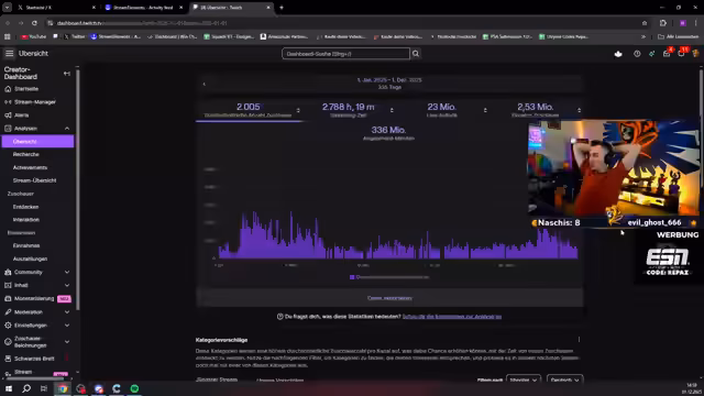 00:10:11Der Streamer analysiert seine Streaming-Statistiken der vergangenen Jahre. 2024 und 2022 sind mit jeweils ca. 2650 Stunden fast identisch. Ein Höchstwert von 3107 Stunden im Jahr 2023 wird auf einen durchgezogenen 'Sabaton'-Stream zurückgeführt, den er als nicht regulär betrachtet. Sein Ziel für das aktuelle Jahr ist, ohne solche Extreme die 3000-Stunden-Marke zu erreichen. Er betont, dass er sich keinen Druck machen möchte, da er bereits 2020, trotz der Corona-Pandemie, am wenigsten gestreamt hat, was zeigt, wie unregelmäßig seine Streaming-Aktivitäten sind.