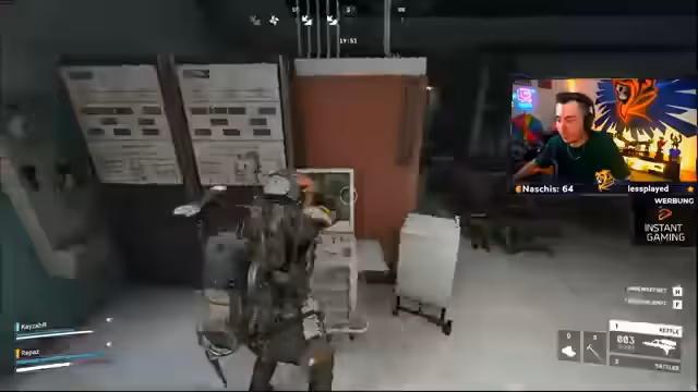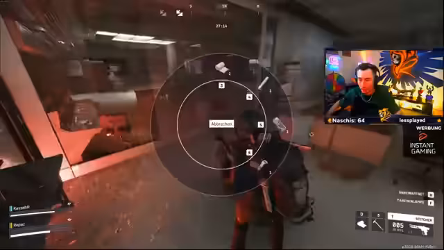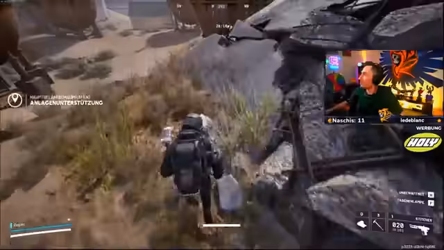01:44:22Auf der Suche nach seltenen Bauplänen für eine Werkbank, insbesondere für den Bastion, begeben sich Streamer und sein Team in eine riskante Situation. Sie planen, einen Gegner gezielt zu töten, um dessen Teile zu erbeuten, werden aber in einen Kampf verwickelt. Währenddessen diskutieren sie die beste Vorgehensweise und die Gefahren, die von speziellen Gegnern wie dem Rocket ausgehen.