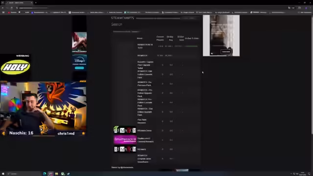 00:37:22Nachdem der Streamer sein Spiel für den Tag noch nicht festgelegt hat, erkundigt er sich nach Vorschlägen aus dem Chat. Es werden verschiedene Spiele wie Valorant, Marvel Rivals und diverse Steam-Spiele genannt. Es folgt eine Diskussion über Streaming-Plattformen wie Steam Charts und die beeindruckenden Spielerzahlen von Spielen wie Elden Ring und Cyberpunk, was den Streamer beeindruckt.