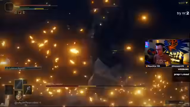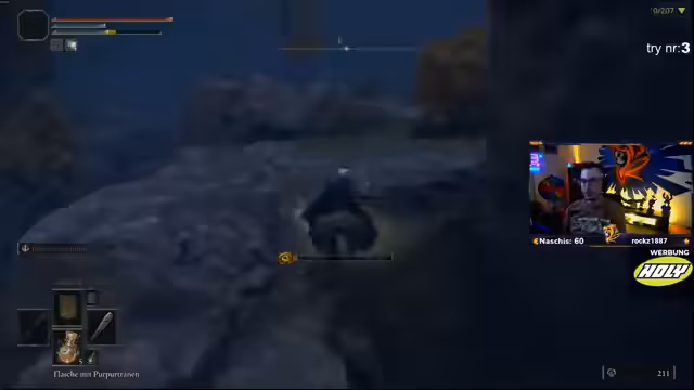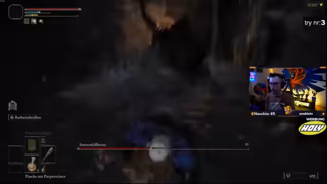 02:55:14Eine der größten Herausforderungen der Challenge, die der Streamer stets betont, ist der Umstand, dass er gezwungen ist, als Heavy-Roller zu spielen. Durch den geringen Ausdauerwert sind schnelle Ausweichmanöver unmöglich, was ihn zu einem 'tanking' von Angriffen zwingt und das Spiel für jeden Bossfight extrem gefährlich macht. Er beschreibt die Unzufriedenheit mit diesem Spielstil, der den Charme von Elden Ring nimmt, und erkennt an, dass diese Spielweise einen hohen Skill erfordert, den er momentan nicht vollständig beherrscht.