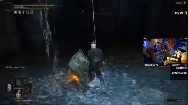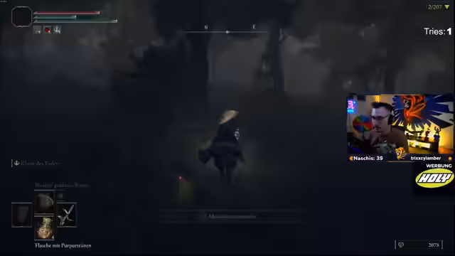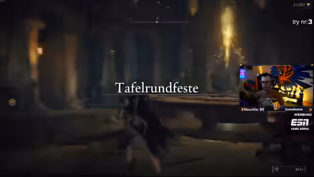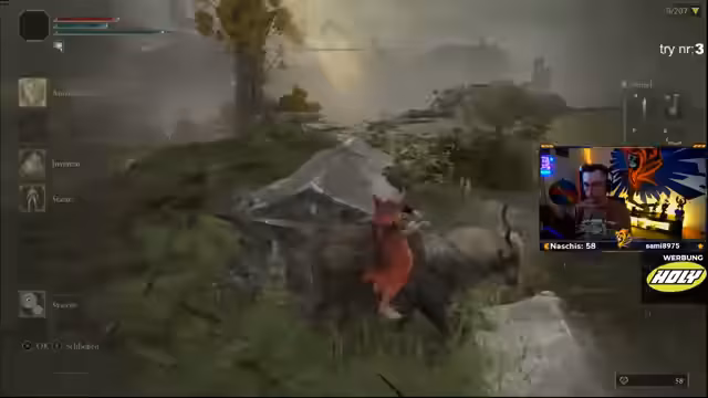 06:05:13Der Streamer nähert sich dem Ende der ersten Region. Nachdem er den relativ einfachen Baumgeist mit Geschwüren besiegt hat, stellt er fest, dass sein nächster Boss, 'Messmer, Phase 2', der Run-Killer sein könnte. Die fehlende heilige Träne und die schwache Heilung machen den Kampf zu einer enormen Herausforderung. Obwohl die Waffe 'Blut- und Reißzahn' auf plus 5 geupgraded werden konnte, bleibt die Situation angespannt.