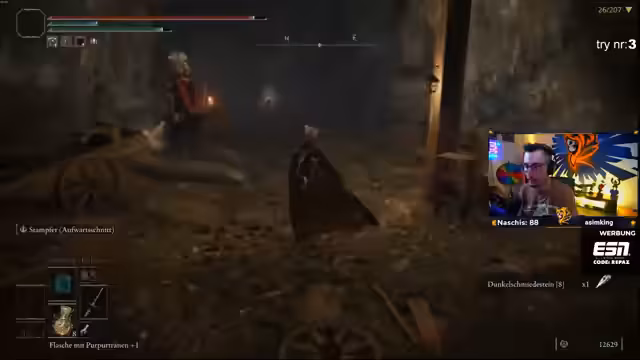 03:46:33Ein zentrales Problem wird die überladene Ausrüstung, insbesondere der schwere Schild 'Große Last'. Dies führt zu 'Fatroll', was die Ausweichfähigkeit massiv einschränkt und den Spieler sehr verletzlich macht. Da das Schild automatisch ausgerüstet wird und im Rahmen der Challenge nicht getauscht werden darf, steckt der Streamer in diesem Zustand fest und macht die laufenden Kämpfe, besonders gegen Bossen wie die 'Grabhüter-Wachen', zur Tortur, da seine Heilungsmöglichkeiten ebenfalls äußerst ineffektiv sind.