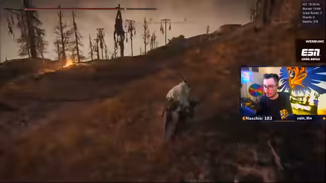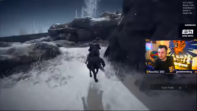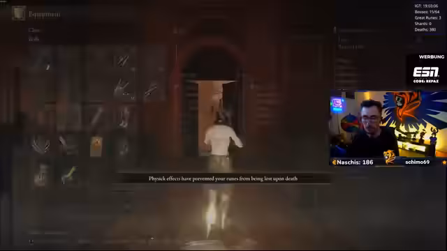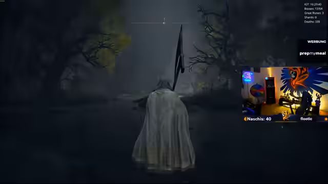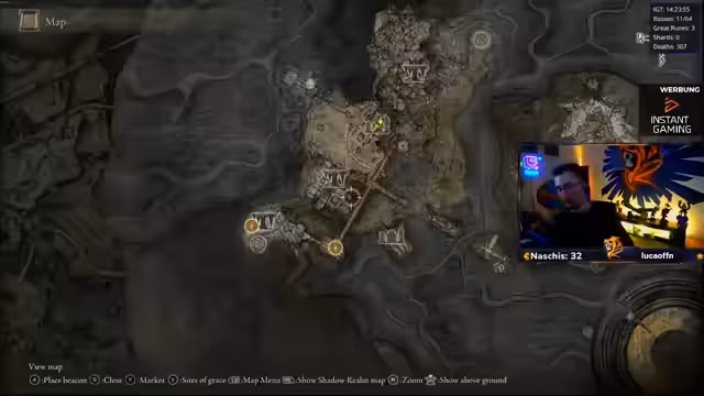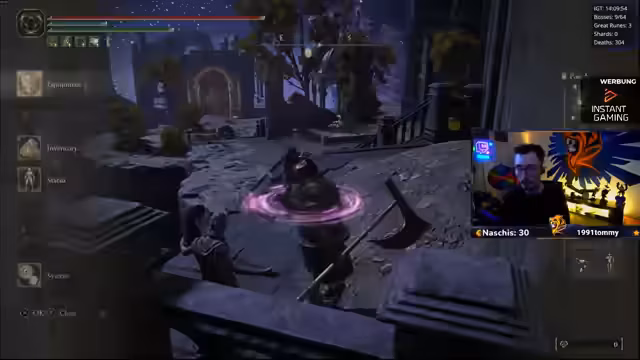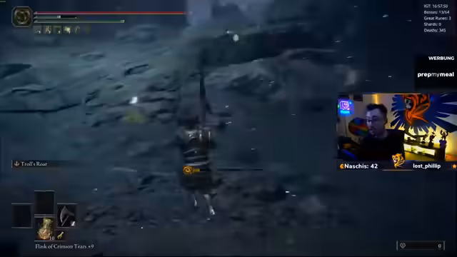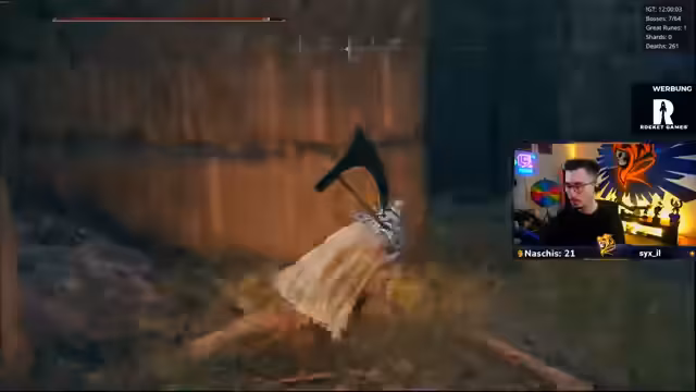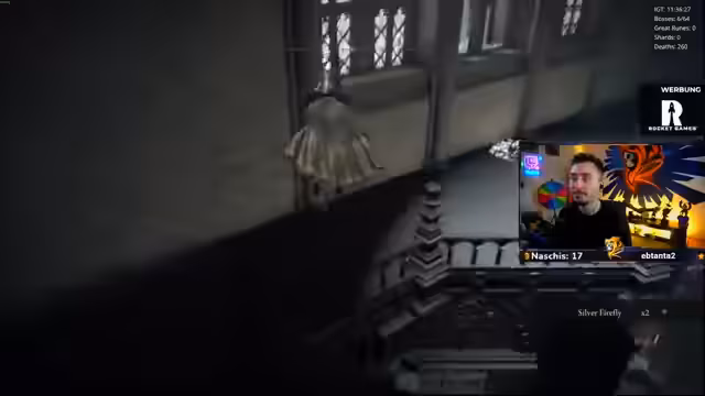 00:13:33Nach technischen Vorbereitungen wird der Spielmodus 'Nightmare Seed' gestartet. Ein 'Randomizer' wird gespielt, bei dem Waffen und Bosse zufällig platziert sind. Der Streamer hat bereits eine neue Waffe und hat gestern mehrere Bosse besiegt, darunter den 'Radar-Bossfight' und den 'Todesriepenvogel', der trotz 'One-Shot'-Attacks besiegt wurde. Als Belohnung kann die aktuelle Waffe auf Eis gelegt und ein 'Rinala-Spot' als nächstes Ziel freigeschaltet werden.