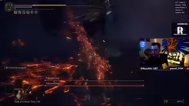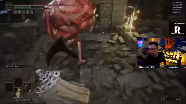 08:28:56Im weiteren Verlauf des Streams setzt der Streamer auf eine vorsichtige Taktik, um den übermächtigen Gargoylen zu begegnen. Er erkennt, dass deren Kampfsystem basierend auf RNG-Trigger funktioniert, bei dem ein Gargoyle den anderen bei bestimmten schwarzen Flammen-Attacken ruft. Um die unfaire Situation zu entschärfen, entscheidet er sich für ein taktisches Manöver: Er nutzt den Fahrstuhl als 'Safe Zone', während er den Aggro der Monster kontrolliert, indem er den Fahrstuhl zur richtigenzeit abschickt, um dem Kampf zu entgehen.