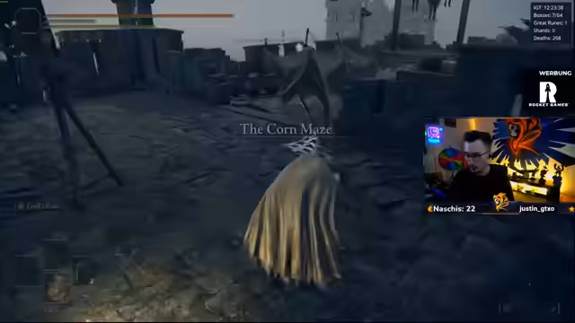 00:23:13Der Streamer betritt ein Labyrinth im 'Limgrave', das als Albtraum beschrieben wird. Er findet einen 'Hund', der alles One-Shotten kann, und fühlt sich von den Moddern getäuscht, da der Ausgang nur durch eine unsichtbare Wand blockiert ist. Nach kurzer Verwirrung findet er den richtigen Weg und hebt einen 'Warming Stone' auf. Nach kurzer Erkundung stößt er auf den letzten 'Limgrave-Boss', 'Scheusale'.