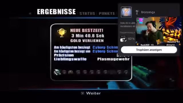 05:21:30Es wird die Platin-Trophäe verliehen. Es wird die Irrenliga gestartet, bei der 32 Abschüsse erreicht werden müssen. Es wird die Frage aufgeworfen, ob es Controller-Vibrationen auf der PS2 gab. Es wird ein neues Spiel gestartet, Gladiator, bei dem man Erster und 20 Abschüsse erreichen muss. Es wird die Schwierigkeit der Waffen betont. Es wird ein neues Spiel gestartet, bei dem man Gold in 5 Minuten 30 erreichen muss, eine ultraschwere Infiltration. Es wird die Frage aufgeworfen, wie viele Platin-Trophäen es gibt. Es wird die Elite Liga gestartet, bei der 25 Punkte in 3 Minuten 30 erreicht werden müssen. Es wird die Schwierigkeit betont und die Frage aufgeworfen, wie die Gegner so schnell die Coins einsammeln. Es wird ein neues Spiel gestartet, bei dem 40 Abschüsse in 2 Minuten erreicht werden müssen. Es wird die Frage aufgeworfen, ob es noch eine Liga gibt. Es wird ein neues Spiel gestartet, Raumdeckung, bei dem 35 Punkte in 3 Minuten erreicht werden müssen. Es wird die Langsamkeit des Charakters betont und die Notwendigkeit von Geschwindigkeits-Power-Ups. Es wird ein neues Spiel gestartet, Deathmatch, bei dem zehn Abschüsse in zwei Minuten zehn erreicht werden müssen. Es wird die Freundin von Harry Tipper erwähnt. Es wird ein neues Spiel gestartet, Capture the Flag, bei dem vier Punkte erreicht werden müssen. Es wird die Ansagerin gelobt. Es wird ein neues Spiel gestartet, bei dem 30 Abschüsse in 2 Minuten 25 erreicht werden müssen. Es wird ein neues Spiel gestartet, bei dem Erster und 20 Punkte erreicht werden müssen. Es wird die Frage aufgeworfen, ob die Affen als Kills zählen. Es wird die Frage aufgeworfen, was die Ente für Schaden macht. Es wird die Frage aufgeworfen, was Banzai bedeutet.