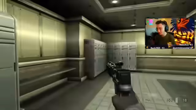 02:49:46Der Streamer interagiert mit der Spielfigur Dr. Fergal und kommentiert die vielen neuen Leute im Labor. Er spielt sich durch den Level, kommentiert die Musik und die Gegner. Er findet einen Laborkittel und zieht sich in der Dusche um. Er kommentiert die Ungenauigkeit der Shotgun und bemerkt, dass die Shotgun schlecht ist. Er kämpft gegen Mutanten und lädt Forschungsdaten herunter, um Crowe zu erledigen. Er kommentiert die Schwierigkeit des Spiels und fragt sich, ob er sich übernommen hat. Er bemerkt, dass er sich erst bei der Hälfte der Story befindet und schon zweieinhalb Stunden gespielt hat. Er erwähnt, dass er sich an eine Stelle erinnert, die er immer gerne gemacht hat, obwohl man es gar nicht machen musste.