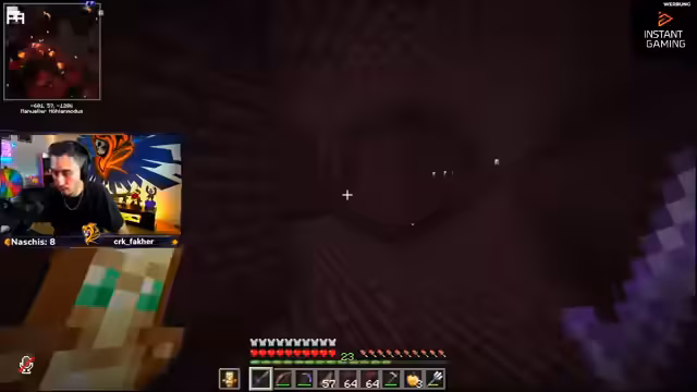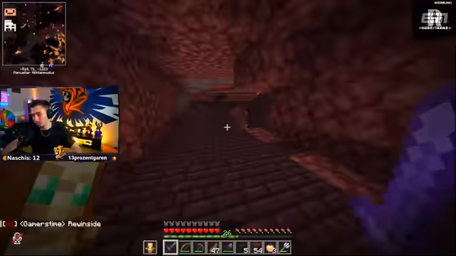 00:47:54Der Streamer reist in den Nether, um dort gezielt Wither zu farmen und die nötigen Köpfe für die Beacon-Projekte zu beschaffen. Er entdeckt ein sehr effektives Soul Sand Valley und beginnt, gezielt auf die Kreaturen zu jagen. Um die Farmung unterhaltsamer zu gestalten, initiiert er ein Wettspiel mit dem Chat, bei dem darauf gewettet wird, ob die nächsten fünf getöteten Wither einen Kopf droppen. Dieses interaktive Element prägt den gesamten Zeitabschnitt im Nether.