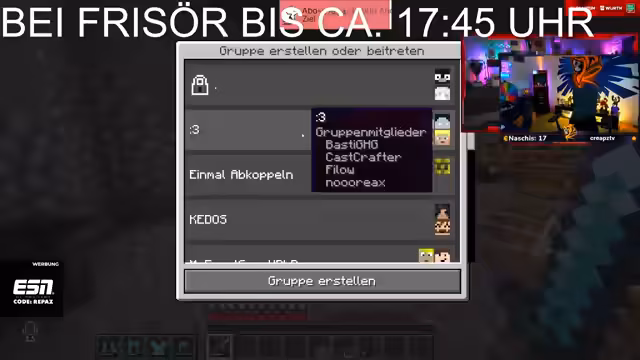 00:57:38Nach einem erfolgreichen Farm-Abenteuer teilt der Streamer eine persönliche Erfolgsgeschichte mit dem Chat: Er hat nach langer Zeit die letzte benötigte Karte für sein Set in Pokémon TCG Pocket gezogen. Kurz darauf wendet er sich wieder der Minecraft-Gruppe zu, um die aktuelle Situation zu klären. Es wird ein Meeting für 15:15 Uhr anberaumt und es herrscht Verwirrung über die Baupläne und die Verantwortlichkeiten innerhalb des Teams, insbesondere die Schwamm-Probleme und die fehlende Beteiligung aller Mitglieder.