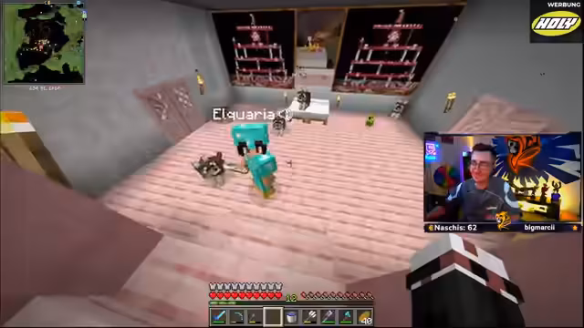 02:36:01Der Streamer konfrontiert einen Mitspieler ('Cuba') mit Diebstahl von Laternen, Emeralds und Obsidian, droht mit Konsequenzen ('Tanga tragen') und verhandelt über Rückgabe. Dabei wird über Minecraft-Enchantments debattiert, insbesondere 'Dichte' (Luftschaden) und 'Durchbruch' (Rüstungsbrechung), deren Kombination auf Waffen strittig ist. Am Ende wird die Pokémon DLC-Planung wieder aufgenommen.