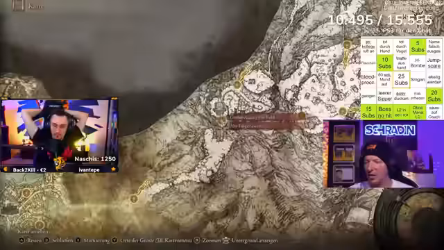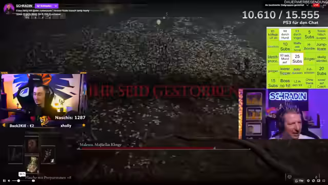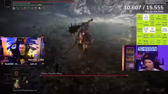 09:46:33Nach den technischen Problemen wird der letzte Weg zu Malenia fortgesetzt. Der Coach gibt detaillierte Anweisungen für Sprünge und Routen, während der Spieler Fehler macht und frustriert ist. Der Streamer unterhält das Publikum, indem er über eigene Randomizer-Erlebnisse spricht und über seine Erfolgsgeschichten. Abschließend erreichen Schradin und der Coach das Tor zu Malenia. Der Streamer drängt den Spieler, das Spiel heute noch zu beenden, und plant, Schradin motivierend anzurufen, da dessen Laune durch die lange Spielzeit bereits sehr schlecht geworden ist. Die Session endet mit der Aussicht, dass der finale Bosskampf bevorsteht.