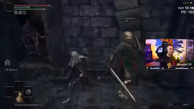 10:00:26Schradin kämpft gegen Margit und wirkt desorientiert, was zu einer anhaltenden Frustration führt. Er wird für sein gieriges Verhalten kritisiert, da er zu oft lebenserhaltende Tränke verwendet. Trotz eines angeblich starken Builds mit Katana auf Plus 5 fehlt ihm der Schmiedestein für das maximale Upgrade. Sein Mana-Ressourcen sind ebenfalls erschöpft, was seine Taktik massiv einschränkt und seine Kampffähigkeit stark reduziert.