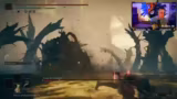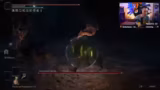 01:43:48Der Streamer beginnt mit den Kämpfen gegen die ersten Bosskämpfe des DLCs, insbesondere den ersten DLC-Boss, der als extrem schwierig und schlimmer als der Endgegner Moog beschrieben wird. Nach mehreren Toden und frustrierenden Versuchen gelingt es ihm, den Boss zu besiegen, indem er seine Waffe wechselt und seine Strategie anpasst. Die Kämpfe werden durch die schlechte Sichtbarkeit in der dunklen Umgebung erschwert und erfordern eine präzise Ausweichen sowie das Meiden von Angriffen.