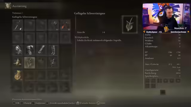 02:32:08Nach dem Sieg über den ersten Boss entscheidet sich der Streamer, seinen Build weiter anzupassen. Er experimentiert mit verschiedenen Schwertern und Talismanen, darunter auch eine Maske, die seine Arcan-Energie verringert, aber für mehr Ausdauer sorgt. Er debattiert mit dem Chat über die Effektivität von Frost- im Vergleich zu Blutungsschaden und entscheidet sich, seine Stärken zu optimieren und seine Ausrüstung zu wechseln, um für die kommenden Herausforderungen gewappnet zu sein.