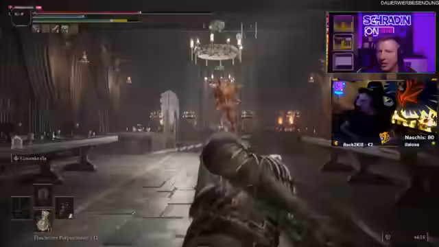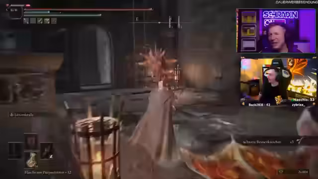 07:15:32Nachdem Schradin einen Drachen besiegt hat, wird die Szene mit dem Synchronsprecher kommentiert und gewürdigt. Es wird besprochen, wie man zu einem bestimmten Punkt gelangt, um den nächsten Boss zu erreichen. Reapaz gibt Anweisungen, die jedoch zu einigen Fehltritten und Stürzen führen. Blubberbob wird für seine großzügigen Spenden und Unterstützung gelobt, was zu einem erreichten Abo-Ziel führt. Der Weg zum nächsten Boss wird fortgesetzt, wobei Reapaz Anweisungen gibt und Schradin diese umsetzt, was nicht immer einfach ist. Es wird über die Schwierigkeit des Spiels und die Herausforderungen gesprochen, die noch bevorstehen. Schließlich erreicht Schradin eine Gnade, einen Speicherpunkt im Spiel, und bereitet sich auf den bevorstehenden Bosskampf vor. Es wird spekuliert, um welchen Boss es sich handeln könnte und welche Strategien anzuwenden sind. Reapaz gibt den Rat, sich überraschen zu lassen und den Kampf anzugehen. Es wird eine Wette abgeschlossen, ob Schradin den Boss im ersten Versuch besiegen kann. Vor dem eigentlichen Kampf wird noch ein spezieller NPC beschworen, um dessen Dialoge anzuhören, was als Hommage an den Synchronsprecher gedacht ist. Nach diesem kurzen Intermezzo bereitet man sich auf den eigentlichen Bosskampf vor.