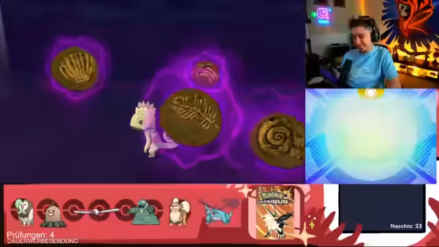 01:30:33Die Shiny-Jagd setzt sich fort, und der Streamer kämpft darum, die Kette aufrechtzuerhalten. Er muss ständig heilen, da sein Pokémon angeschlagen ist und gegnerische Attacken wie Verbrennungen erhält. Der Prozess wird als sehr nervig beschrieben, da die Kette jederzeit brechen kann und er die Angriffspunkte (AP) der gegnerischen Pokémon im Auge behalten muss. Er zeigt Frustration über die lange Dauer und die Ungewissheit der Jagd.