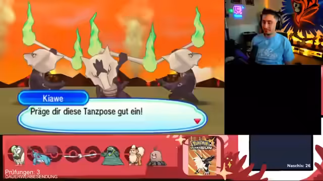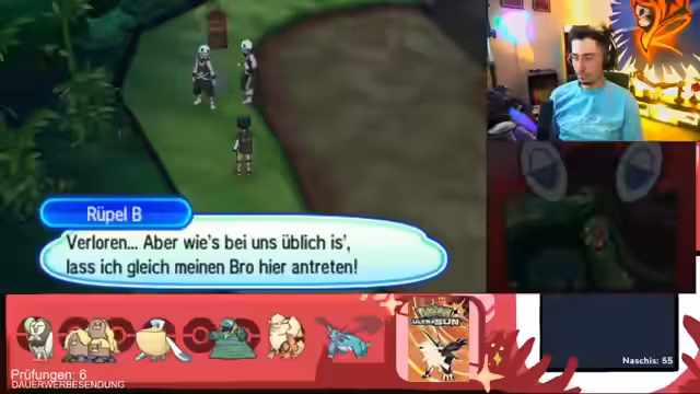 02:55:59Der Streamer steht einem extrem schwierigen Trainer gegenüber, der einen 'Scanner'-Move verwendet, der seine Pokémon stark schwächt. Nach mehreren gescheiterten Versuchen ist er wütend und frustriert. Er entscheidet, eine Pause zu machen, um seine Pokémon zu heilen. Nach der Rückkehr versucht er erneut den Kampf, wechselt Brutalander ein, um den 'Bedroher' zu aktivieren, und kann den Kampf letztendlich gewinnen.
