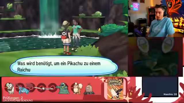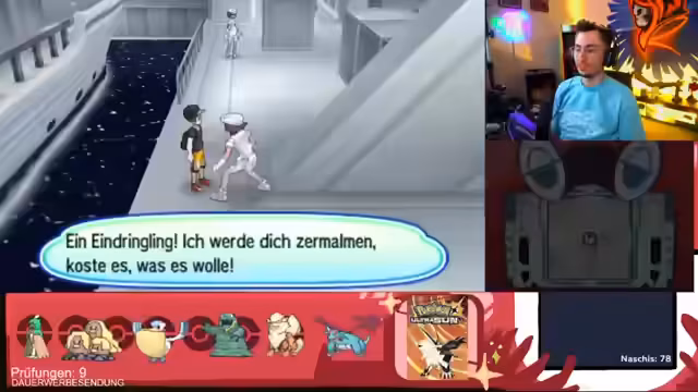 00:16:55Der Streamer beginnt eine Prüfung, bei der er eine Reihe von Pokémon besiegen muss, um ein Herrscher-Pokémon herbeizurufen. Er muss dabei Lusardin im Wasser bekämpfen, die stromabwärts schwimmen. Während des Kampfes stellt er fest, dass sein Team nicht optimal aufgestellt ist und er gegen die Gegner kämpft, ohne Items wie Beleber zu nutzen, um den Kampf fair und herausfordernd zu gestalten. Er verliert mehrmals und muss seinen Ansatz überdenken.