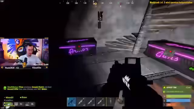 06:19:58Im Supermarkt herrscht Chaos, Schüsse fallen und es wird vermutet, dass jemand einen Tag-Heli gestohlen hat. Ein Spieler namens Philo stirbt, während andere versuchen, die Situation zu überblicken und zu looten. Vicky wird angewiesen, den Supermarkt zu verlassen und nur eine Thompson mitzunehmen. Es stellt sich heraus, dass Vicky beim Cargo geholfen und zwei Kills erzielt hat. Es gibt Probleme mit den Turals, die den Sprecher behindern, und er kann sich kaum in der Base bewegen. Michael ist auf dem Weg, um zu helfen, und es wird überlegt, ob Philo im Supermarkt gestorben ist und ob er eine Blue Card dabei hatte. Die Spieler suchen nach Ausrüstung und versuchen, die Situation zu meistern, während sie gleichzeitig von Bots angegriffen werden. Tapsi wird um Hilfe gebeten, aber er muss kurz nach Hause fahren. Es wird überlegt, ein Bündnis mit Matze einzugehen und Chef Strobel zu überraschen. Ein Military Transport Helikopter kommt an und es wird überlegt, wie man den Heli am besten zerstört, ohne zu viel Schaden zu verursachen. Die Spieler tauschen sich über die beste Taktik aus, um den Heli zu zerstören und Rockets einzusetzen.