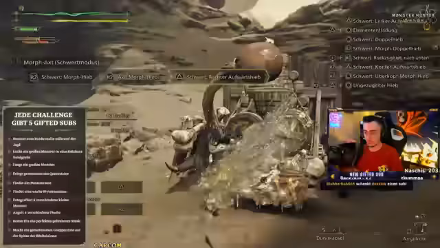 03:30:53Nachdem alle Codes verteilt wurden, äußert der Streamer seine Unentschlossenheit bezüglich der Waffenwahl in Monster Hunter Wilds und überlegt, möglicherweise zwei Waffen gleichzeitig zu spielen. Er testet verschiedene Waffen, darunter den Longshot, mit dem er Monster Hunter World durchgespielt hat, sucht aber nach Abwechslung. Besonders angetan ist er von der Morph-Axt, deren Moveset und Charge-Funktion er zu erlernen versucht. Er experimentiert mit verschiedenen Kombos und Modi der Waffe, wie dem Schwert- und Axt-Modus, und versucht, die Anzeigen und Auflademechanismen zu verstehen. Trotz anfänglicher Schwierigkeiten mit dem Charge-System findet er die Waffe sehr ansprechend und erwägt, sie zu seiner Hauptwaffe zu machen. Er schaut sich ein Tutorial-Video an, um die komplexen Mechaniken der Morph-Axt besser zu verstehen, und entdeckt neue Moves und Kombos. Dabei lernt er, dass das Aufladen der Schwertelemente und Achselemente wichtig ist, um maximalen Schaden zu verursachen. Er übt verschiedene Angriffe und Entladungen und ist begeistert von den vielseitigen Moves der Waffe. Er versteht langsam, wie man die Axt auflädt, um das Schwert nutzen zu können, und experimentiert mit verschiedenen Kombos, um den unteren Bereich der Axt aufzuladen.