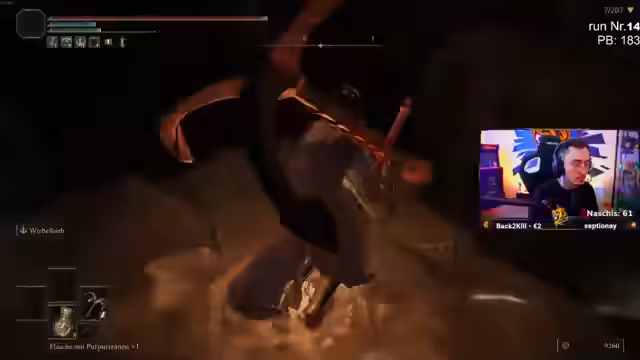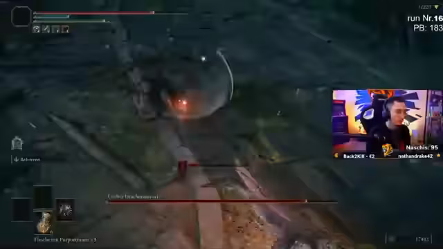 00:07:14Der Streamer analysiert den vorangegangenen No-Death-Run, der am 12. Versuch am "Kläger" (Cursitor of_APPLICATION) gescheitert ist. Dieser DLC-Miniboss ist als Gimmick-Boss konzipiert, der Duplikate von sich erschafft. Die Laufzeit der Verfluchung skaliert leider mit der Stärke des Bossraums, was zu einem extrem hohen Leben des Klägers führte. Die leichten Angriffe des Streamers reichten nicht aus, um die Duplikate rechtzeitig zu eliminieren, was zum unweigerlichen Tod führte, da die Verfluchung unabhängig von der Lebensanzeige zum Tod führt.