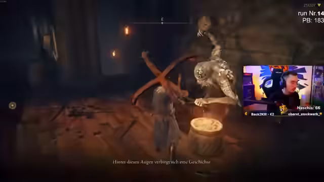 09:36:46Der Kampf gegen den Fakel von Centrina beginnt, der als 'easy' eingestuft wird, aber ein gefährliches Instakill-Gimmick ab 30% Leben hat. Dies erfordert strategisches Vorgehen und genaues Timing. Parallel dazu werden Waffen gegen den Kläger-Boss getestet, wobei die Falks als Option mit Running R2 oder R1 im Gespräch sind. Die Pferdermaske als mögliche Verbesserung der Kondition wird erwähnt. Der Streamer betont die Notwendigkeit, die Waffen an die spezifischen Bossanforderungen anzupassen.