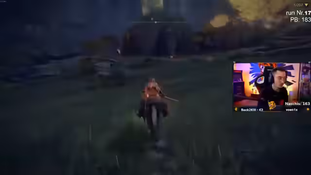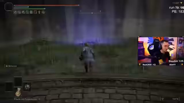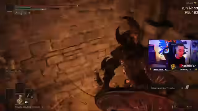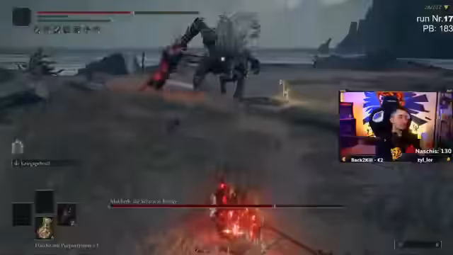 03:18:52Ein kritischer Fehler führt zum Tod des Streamers. Der 'Open-World-Boss Radagon' wird aus Versehen ausgelöst, statt wie geplant zu umgehen. Dieser erweist sich als extrem stark, da seine Geschosse selbst im Sprint und auf dem Pferd immer treffen. Der Run scheitert hier, und der Streamer lernt für die Zukunft, Radagon auf jeden Fall zu meiden.