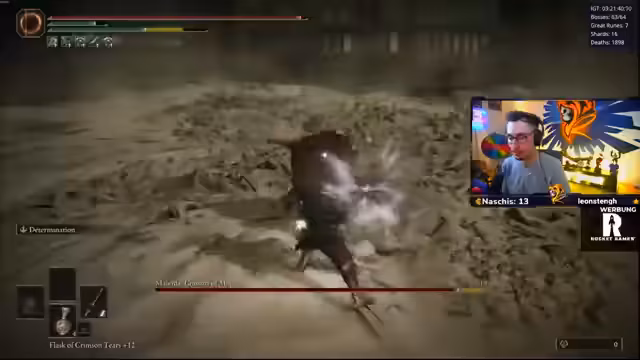 02:12:11Der Stream beginnt mit einer chaotischen Runde im Nightmare Seed Director's Cut Modus. Das Team muss mehrere Aufgaben erfüllen, um zu überleben. Nachdem der Gegner Malenia besiegt wurde, explodiert die gesamte Küche, und die Spieler werden durch den Raum geschleudert. Das Team feiert den Sieg, verliert dabei aber einige ihrer Ausrüstungsgegenstände und muss sich neu orientieren. Das Hauptziel ist es, den Gegner zu eliminieren, was aber durch chaotische Umstände erschwert wird.
