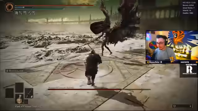 00:15:48Der Streamer dokumentiert den Kampfverlauf durch die vier Phasen von Malenia. In Phase 1 konzentriert er sich auf das Erlernen der Angriffsmuster. In Phase 2 beschreibt er die enorme Geschwindigkeit und die Notwendigkeit von Tränken. In Phase 3, in der die Bossin 1,5-facher Geschwindigkeit agiert, werden Fehler wie ein frühzeitiger Verbrauch des Runenbogens thematisiert. Der Fokus liegt auf dem Erkennen und Strafen von Angriffen, um Schaden zu vermeiden.
