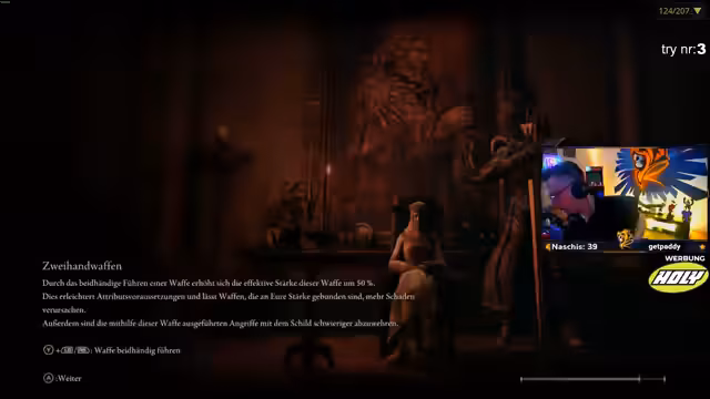 02:56:53Nachdem der Streamer eine neue Waffe, einen Dolch mit Blut- und Frosteffekten, findet, muss er eine strategische Entscheidung treffen. Mit dieser Waffe kann er den Feuerriesen bekämpfen, aber für den Kampf gegen Radan benötigt er weiterhin die verformte Axt. Da er mit dem aktuellen Debuff von 10% mehr Schaden Radangang in seiner aktuellen Ausstattung nicht überleben kann, entscheidet er sich, seinen Charakter zu erhalten, um die verlorene Axt zurückzuerlangen und den Bossangriff vorzubereiten.