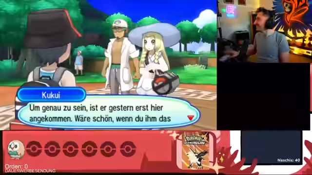 01:14:40Nach verschiedenen technischen Setup-Problemen und Identitätsfragen über seinen im Spiel verwendeten Namen beginnt der Streamer endlich mit Pokémon Ultra Sonne. Er wählt den Namen 'Repairs' für seinen Charakter und erkundet die Alola-Region, die sich ganz anders als erwartet zeigt. Er äußert seine leichte Frustration über die vielen Gespräche im Spiel und die Grafikprobleme, bleibt aber zuversichtlich, eine gute Zeit mit dem Spiel zu haben und freut sich auf die Story.