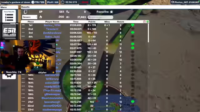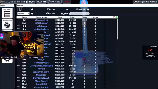 07:00:12Der Streamer spielt mit der Community das Spiel "Marbles on Stream". Nachdem der erste Teilnehmer HNG schnell ausscheidet, gewinnen in den folgenden Runden "Stannino" und "Binobo-Killer". Bei letzterem vermutet der Streamer sogar einen möglichen Weltrekord für den Spieler, da dessen Lauf extrem sauber und schnell war. Der Gewinner "Binobo-Killer" hat laut Streamer das Recht, das nächste Spiel auszuwählen. Der Streamer kommentiert die Runden intensiv und bewundert die schnellen Leistungen der Mitspieler.