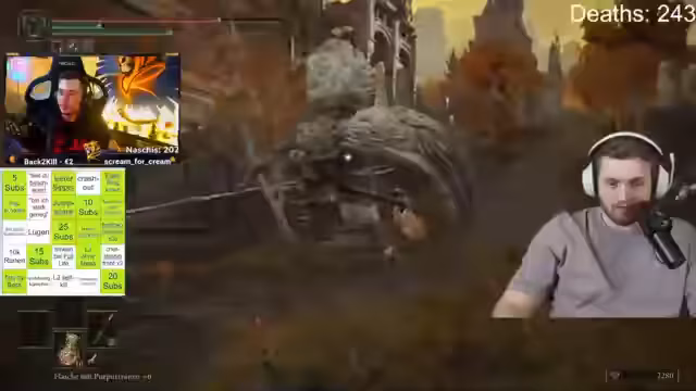 03:00:57Repaz diskutiert seine Kampfstrategie gegen einen Boss in Elden Ring, wobei er feststellt, dass er dessen Attacken besser ausweichen kann, wenn er vor ihm steht, anstatt in ihm drin. Er bedankt sich bei Why Groudon für den 17. Monat und freut sich über Prime Subs von verschiedenen Zuschauern, darunter Mati D's und Ricky Flair. Repaz bemerkt, dass er keinen Schaden verursacht hat, obwohl er selbst getroffen wurde. Er äußert sich optimistisch, den Boss in den nächsten 5-10 Versuchen zu besiegen und bedankt sich bei weiteren Zuschauern für Prime Subs und Sub Gifts. Repaz vergleicht sich mit T-Bag und anderen Instagram-Künstlern und liest Chatnachrichten, in denen er mit ihnen verglichen wird. Er bedankt sich bei LFC Sleepy für vier Monate Prime Sub und bemerkt Schmerzen im ganzen Körper, die ihn aggressiv machen. Er kündigt an den 8er-Bash zu machen und freut sich über weitere Prime Subs. Repaz kommentiert, dass er von 26 Attacken getroffen wurde und entschuldigt sich, dass er die Welle des Bosses nicht dodgen kann.