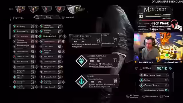 06:53:00Nach mehreren Versuchen passt der Streamer seine Strategie für den Kampf gegen Simon an. Er erkennt, dass Schilde nutzlos sind und beschließt, rein auf Schaden zu setzen. Der Streamer experimentiert mit verschiedenen Pictos (Fähigkeiten) und Charakterbuilds, um den Boss besiegen zu können. Er ist besonders beeindruckt von der Musik des Spiels während des Kampfes, die ihm viel Kraft gibt.