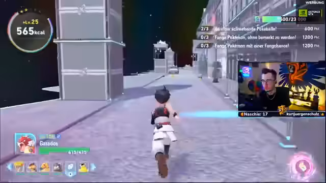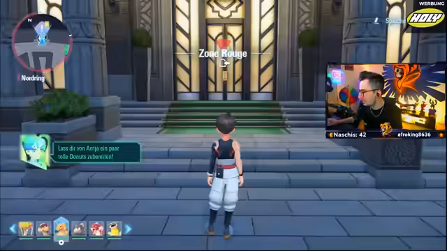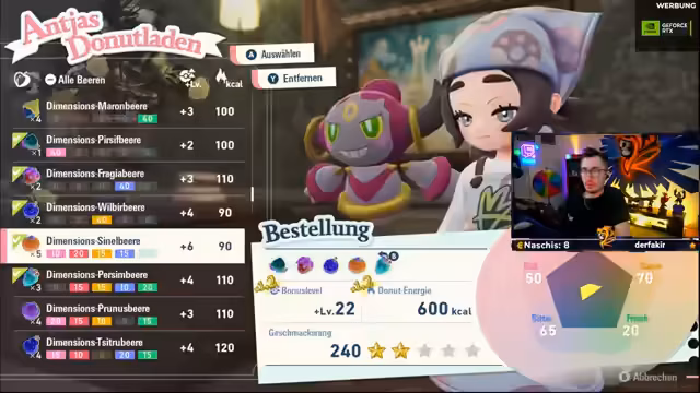 00:55:32Der Streamer übernimmt Missionen im Dimensions-Illuminar, darunter das Besiegen von Mega-Manie-Pokémon und das Crafting von Donuts. Er lernt, dass Donuts nicht direkt leveln, sondern automatisch das 'Plus-Level' erhöhen. Dabei werden Donut-Rezepte mit Süße-Boni diskutiert, um Shiny-Chancen zu steigern, und Goldene Fragezeichen als Quelle für Mega-Steine identifiziert. Geophysur-Attacken mit hoher Verzögerung werden als insta-Kill-Option für schnelle Siege vorgestellt.