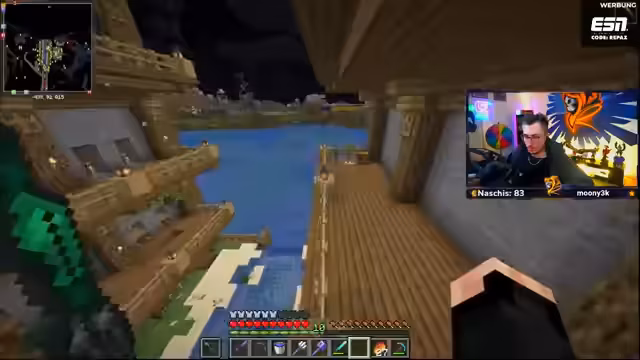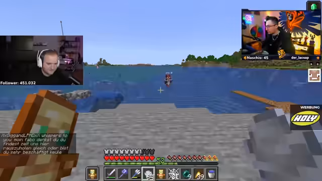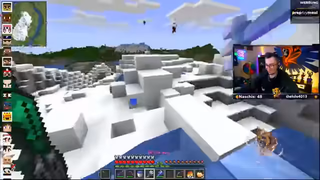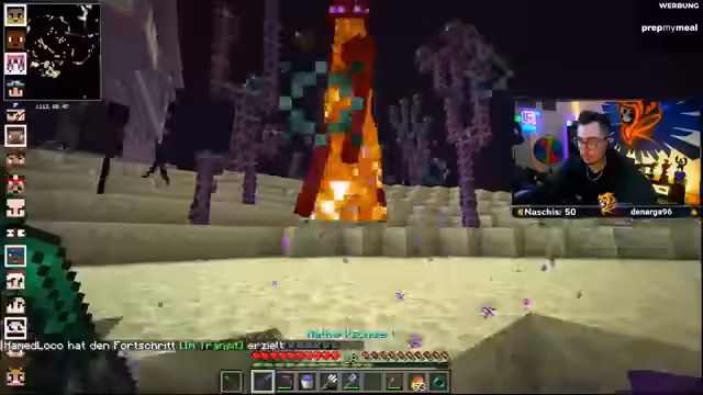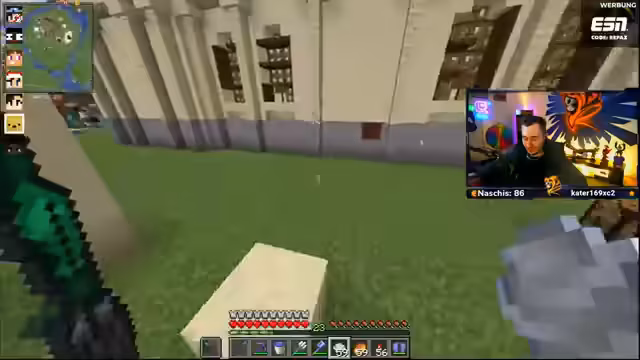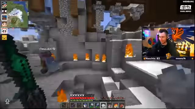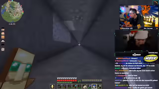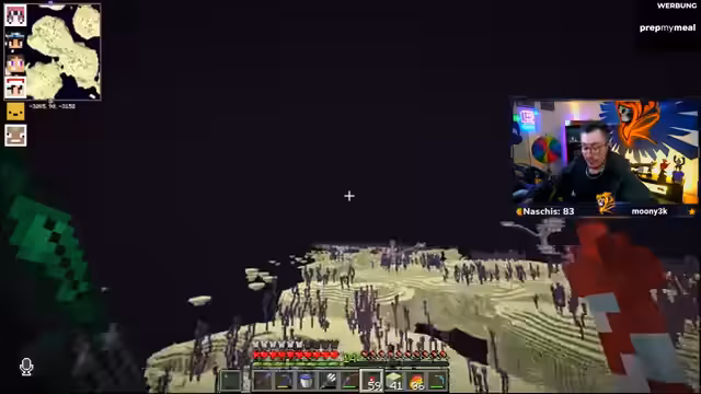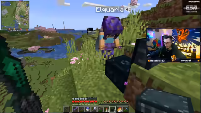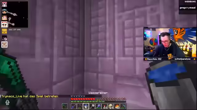 08:37:19Der Fokus liegt auf einem schwierigen Jump-n-Run in Minecraft, bei dem mehrere Spieler scheitern. Es entstehen Diskussionen über Koordinaten für wertvolle Gegenstände wie Elytra und Hämmer, die gegen Bücher oder andere Ressourcen getauscht werden. Der Streamer betont die Unsicherheit beim Springen und verliert mehrfach Leben, während er versucht, Zuschauern wie "Reapers" bei der Beschaffung von Ausrüstung zu helfen.