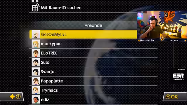 03:39:12Die Vorbereitung für das Mario Kart Turnier läuft auf Hochtouren. Die Team-Captains, der Streamer und 'Reapers', wählen abwechselnd die Teams aus. Nachdem der Streamer mit Jens, Matze, Cyberpunk und Büschra startet, wählt er amüsiert Hamid als letzten 'Ausläufer' für sein Team. Die gegnerische Mannschaft besteht aus Carsten, Eli, Matze, Cyberpunk und Hamid. Wichtige Regeln werden festgelegt: Kein absichtliches Hintenfahren, um Teammates zu behindern, und das gezielte Werfen von Items wie Grünen Panzerwerfern oder Raketen auf eigene Kameraden ist verboten, umFriendly Fire zu vermeiden.