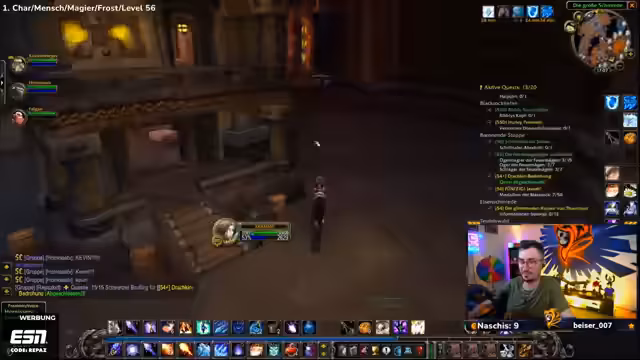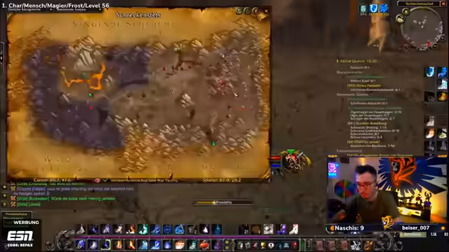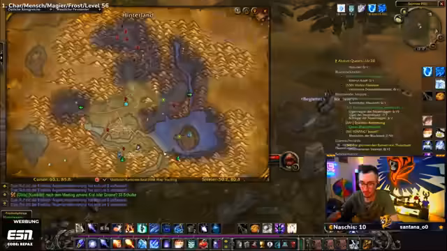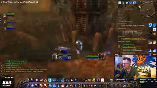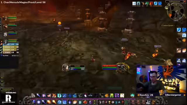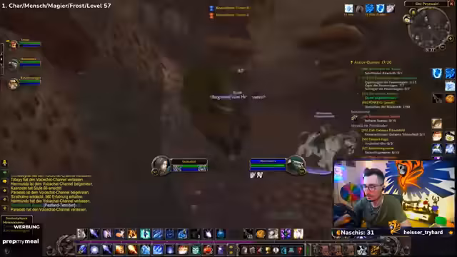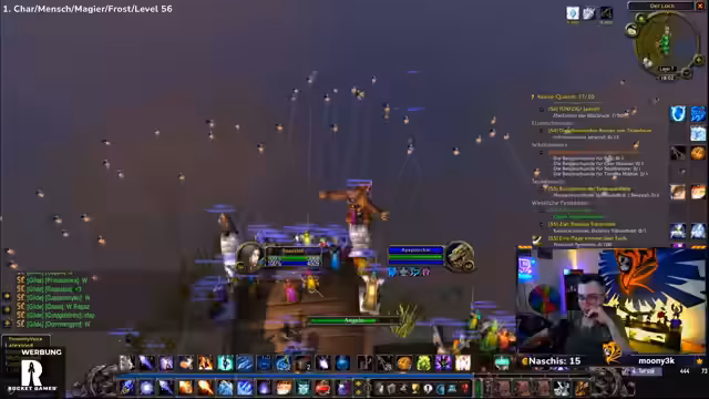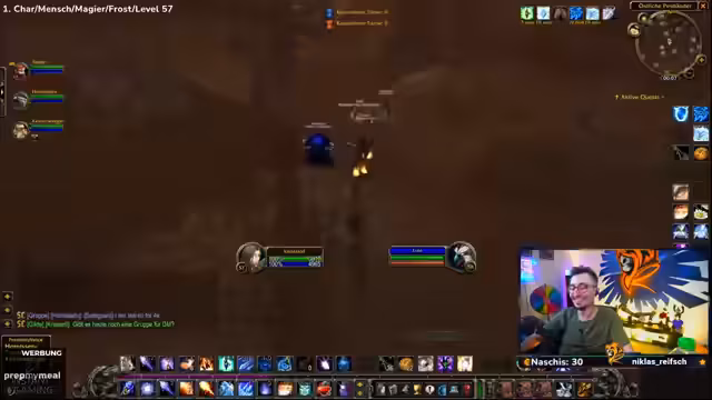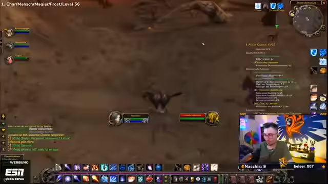 09:32:57In den östlichen Pestländern kämpft die Gruppe gegen verschiedene Gegner wie Hunde und Ghule, wobei mehrere Teammitglieder (Blas, Toro, Kimo, Tee-Cakes) auf Level 60 sterben. Der Streamer reflektiert über strategische Fehler, insbesondere die fehlende Intelligenz-Buffs durch einen unkooperativen Magier, und analysiert die gefährlichen Gebiete mit Ein-Dämonen und gefrorenen Gegnern. Parallel werden Quests gesammelt und abgegeben, darunter eine in der Nähe eines Friedhofs, die 6600 XP bringt.