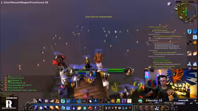 02:37:53Im Chat wird über Angelmechaniken und die Organisation während des bevorstehenden Meetings diskutiert. Es geht darum, dass Teilnehmer während des Meetings parallel angeln können, um Frust zu vermeiden. Konkret wird besprochen, wie man Angelzubehör kauft (z.B. bei einem Händler in Loch Modan), ausrüstet (als Waffe in der Leiste) und verwendet (Rechtsklick auf den Körper beim Auswerfen). Auch Köder wie Nachtkriecher werden erwähnt. Ziel ist es, die Angelmechanik für alle zugänglich zu machen und gleichzeitig das Meeting durchzuführen.