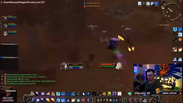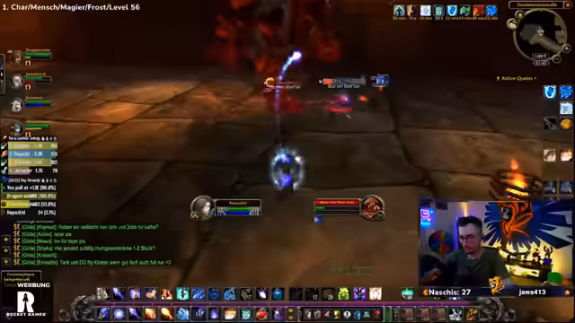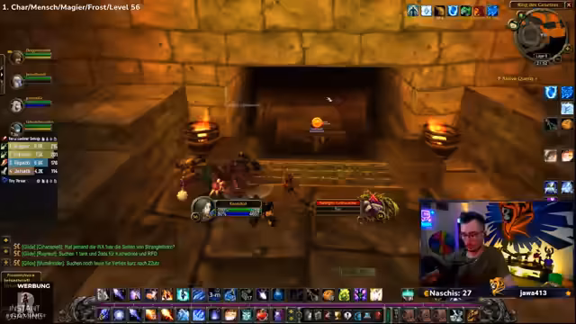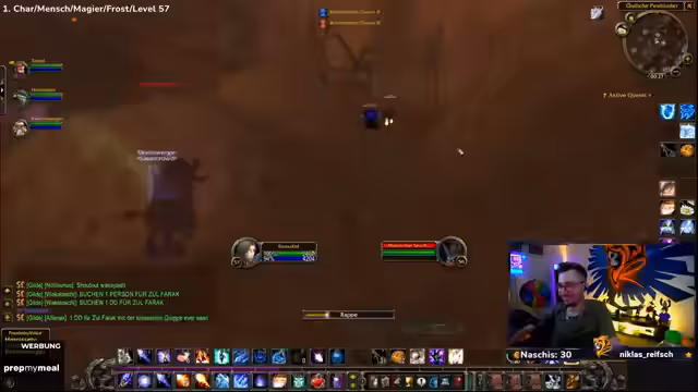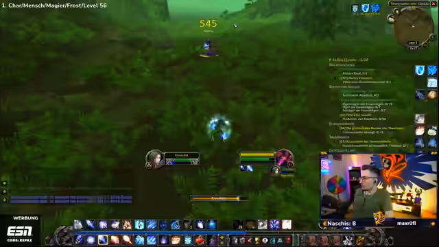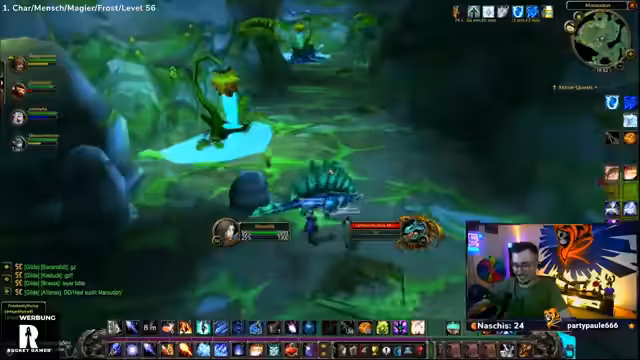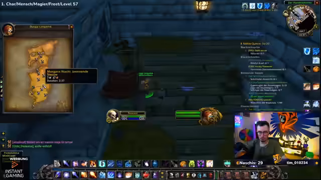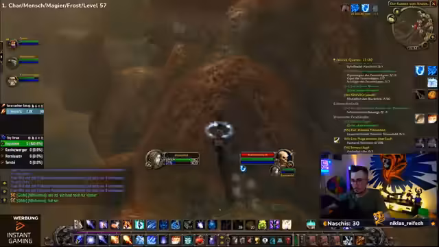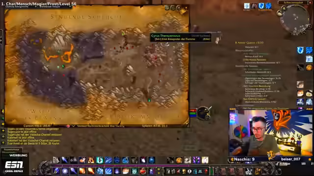 09:32:57Das Stream-Team kämpft mit den Ghouls und Gargulauen in den östlichen Pestländern. Der Streamer muss ohne Intelligenz-Buff spielen, was das Mana-Management erschwert und zu Frustration führt. Trotzdem wird ein Magier-Skin namens Hameas Töter gefunden, der sehr positiv aufgenommen wird. Die Gruppe ist bestrebt, die Quests effizient abzuschließen, stößt aber auf technische Herausforderungen wie einen verlorenten Haien und ein Spawn-Problem bei bestimmten Quests.