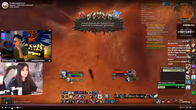 10:01:16Nachdem vier Gruppenmitglieder auf Level 60 gestorben sind, wird der Vorfall analysiert. Die Meinungen gehen auseinander: Ein Teil der Gruppe betrachtet es als Lernerfahrung, während andere es als Rückschlag für das Projekt sehen. Der Streamer ist skeptisch, ob der Raid in nur zwei oder drei Wochen machbar ist, da die meisten der jetzt 19 Spieler nicht raid-tauglich sind. Der Fokus verlagert sich auf das individuelle Leveln, um die Basis für spätere, zufällige Raid-Events zu schaffen.