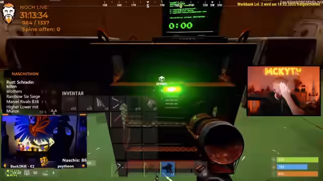 08:40:55Der Streamer schließt sich mit einem Spieler namens Tapsi zusammen, den er versehentlich getötet hat, und bittet ihn um Entschuldigung und Hilfe. Gemeinsam planen sie den Einbruch in das Silo. Bei der Durchführung des Raubzugs kommt es zu einer hektischen Konfrontation mit Bots im Inneren des Silos. Trotz des Erfolgs looten sie den Ort und überlegen nun zukünftige Pläne, wie z.B. das Raiden von gegnerischen Basen.